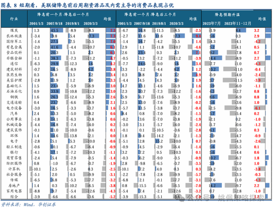风格:大盘、价值占优。从风格上来看,大盘较小盘更优,价值较成长更优,从降息前一个月至降息后一个月来看,大盘代表上证50、沪深300显著跑赢小盘代表的中证1000和国证2000,其中上证50涨幅均值4.5%,中证1000涨幅均值0%。此外,价值代表申万低市盈率指数跑赢高市盈率指数,低市盈率指数涨幅均值3.3%,高市盈率指数0%。23年降息预期升温区间,同样表现出大盘、价值风格相对占优的结构(图表6)。从行业表现上看,经济强相关的周期资源品及内需主导的消费品表现占优。从降息前一个月至降息后一个月的涨跌幅来看,煤炭、有色金属等经济强相关的周期资源品涨幅居前,此外,食品饮料、农林牧渔等以内需为主导的消费品表现同样靠前(图表7)。
