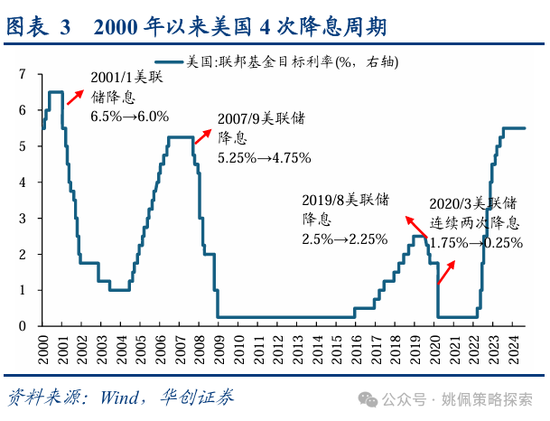 2、六段区间复盘:2000年以来美联储4次开启降息周期(2001/1/3、2007/9/18、2019/8/1、2020/3/3)+23年两次美联储降息预期升温(23年7月、23年11-12月)。