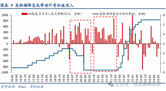 美联储降息或带动外资流入。除了对国内政策的预期以外,美联储降息对A股影响的另一个路径来自外资的流入。当美国市场的资金成本下降、流动性更加充裕时,海外投资者更有可能将资金转移到中国市场,2019年8月美联储开启降息周期后,外资流入显著加速,19年8-12月北上资金累计净流入2434亿元,月均487亿元,显著高于1-7月的155亿元。