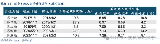 人民币升值区间A股大概率上涨,食品饮料、电子、家电稳定贡献超额收益。我们选取过去5轮典型的人民币升值区间,包括17/1-18/4、18/11-19/3、19/9-20/1、20/5-22/3、22/11-23/2。5段区间内A股整体上涨,万得全A均录得正收益,涨幅均值15.5%。从行业表现来看,电力设备、有色金属、食品饮料、基础化工、电子涨幅均值靠前,其中食品饮料、电子、家电均在5轮区间中4次获得超额收益,表现更为稳定。