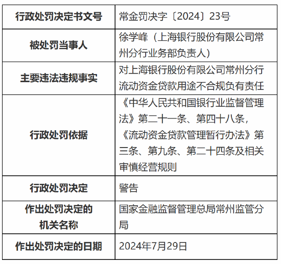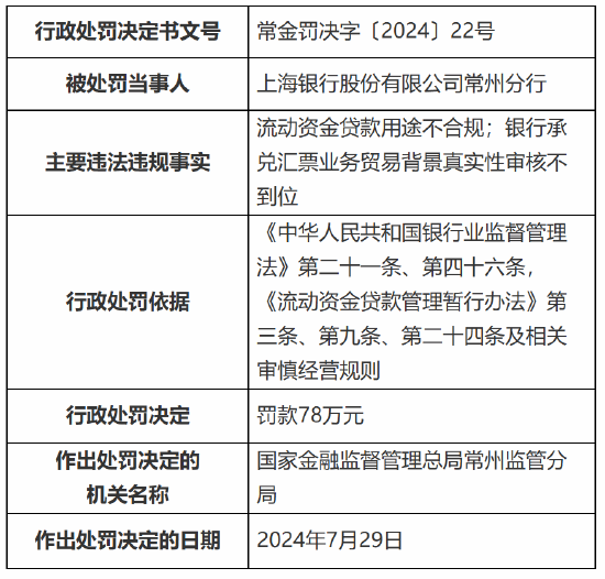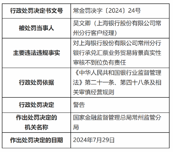 正文 上海银行常州分行被罚78万元:流动资金贷款用途不合规 银行承兑汇票业务贸易背景真实性审核不到位 万生优配 V管理员 /2024-08-05 09:14:08 /0 评论 /83 阅读 0805 此篇文章发布距今已超过426天,您需要注意文章的内容或图片是否可用! 8月5日金融一线消息,国家金融监督管理总局常州监管分局行政处罚信息公开表显示,股份有限公司常州分行因流动资金贷款用途不合规、银行承兑汇票业务贸易背景真实性审核不到位,被罚款78万元。 同时,上海银行股份有限公司常州分行业务部负责人徐学峰、上海银行股份有限公司常州分行客户经理吴文卿被警告。