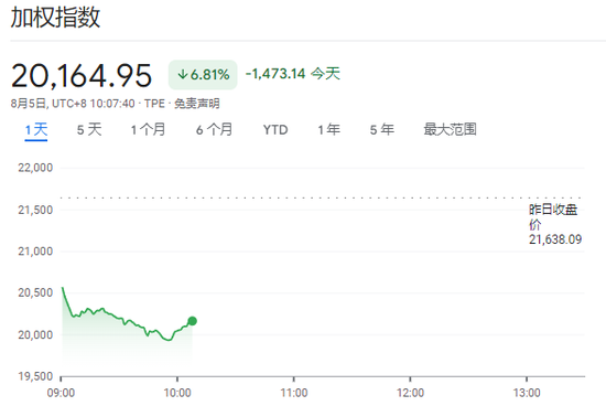 中国台湾证交所加权股价指数跌幅一度扩大至7.1%。