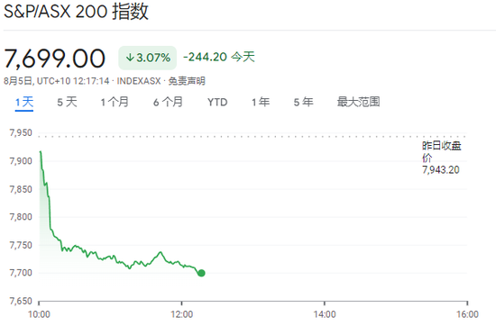 澳大利亚S&P/ASX 200指数跌幅扩大至3%,报7703.9点。