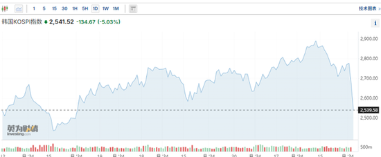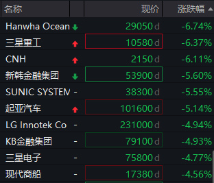 - 韩国KOSPI指数跌幅扩大至5%,韩国Kosdaq指数重挫逾8%触发熔断机制,三星股价跌幅扩大至6%,创2020年以来最大跌幅。