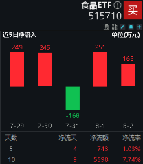 吃喝板块场内热门布局工具食品ETF(515710)近日亦吸金不断。数据显示,截至上个交易日收盘,食品ETF(515710)在近10个交易日中有9个交易日获资金净申购,10日合计净申购额达5598万元。