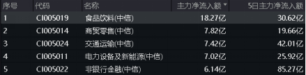 Wind数据显示,今日,吃喝板块获主力资金净流入额达到18.27亿元,净流入额在30个中信一级行业中高居首位;截至今日收盘,近5日吃喝板块累计吸金30.62亿元,吸金额亦在30个中信一级行业中居前。