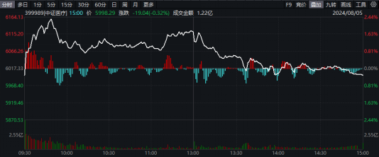 以日内走势来回顾板块今日表现,早盘中证医疗冲高回落,一度上探2.44%,午后突发跳水,持续走低翻绿,收跌0.32%。