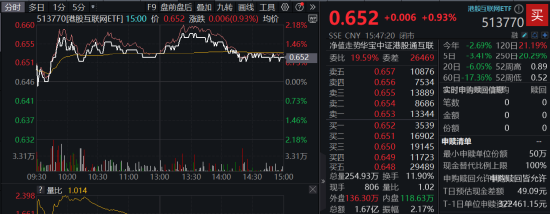 热门ETF方面,重仓港股互联网龙头的港股互联网ETF(513770)早盘高开,全天维持红盘震荡,场内价格最高涨近2%,收涨0.93%,收复5日线,成交额1.67亿元。