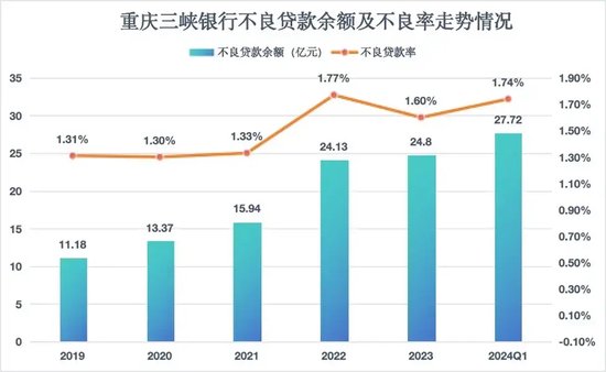 数据显示,2019年-2023年,重庆三峡银行不良贷款余额分别为11.18亿元、13.37亿元、15.94亿元、24.13亿元和24.8亿元,不良贷款余额五年内不断上涨,五年时间增幅高达121.82%,到了今年一季度,该行不良贷款余额继续上探,增长至27.72亿元。