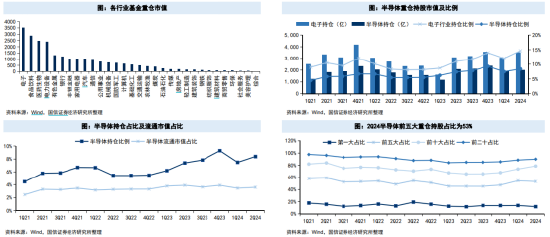基金持仓方面,24Q2基金持续超配于半导体行业,但持仓集中度有所下降。据统计,24Q2基金持有半导体公司市值2,022亿元,持股比例为8.4%,环比提升0.9pct;相比于半导体行业的流通市值3.6%超配了4.8pct。集中度方面,前五大重仓股占比较上一季度下降1.3pct,第一大重仓股()环比降1.9pct。(提及具体公司仅为说明行业观点不构成投资建议,下同)