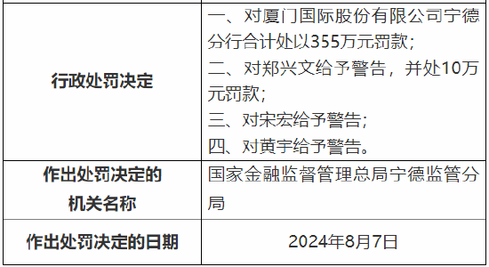 8月9日金融一线消息,国家金融监督管理总局宁德监管分局行政处罚信息公开表显示,厦门国际股份有限公司宁德分行因四项违法违规行为,被国家金融监督管理总局宁德监管分局合计处以355万元罚款。该分行的主要违法违规行为如下: