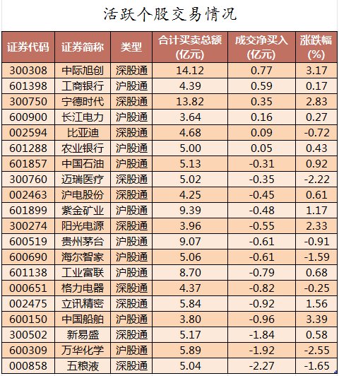 活跃个股方面,北向资金今日净买入较多的有、、宁德时代,净买入金额分别为0.77亿元、0.59亿元、0.35亿元。北向资金净卖出较多的有五粮液、、、、,净卖出金额分别为2.27亿元、1.92亿元、1.84亿元、0.96亿元、0.92亿元。