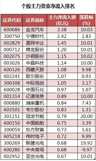 个股来看,今日有1963只个股获主力资金净流入,其中,9股获主力资金净流入超1亿元。主力资金净流入最多,净流入金额为3.38亿元;主力资金净流入居前的个股还有、、、、,净流入金额分别为2.42亿元、1.45亿元、1.2亿元、1.15亿元、1.14亿元。