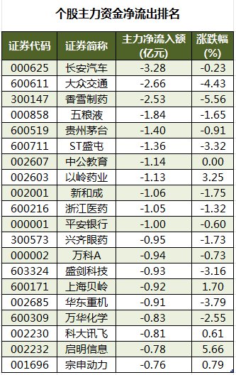 此外,3053只个股被主力资金净卖出,其中,11股被主力资金净卖出超1亿元。主力资金净流出最多的个股是,净流出金额为3.28亿元;主力资金净流出居前的个股还有、、、、,净流出金额分别为2.66亿元、2.53亿元、1.84亿元、1.4亿元、1.36亿元。