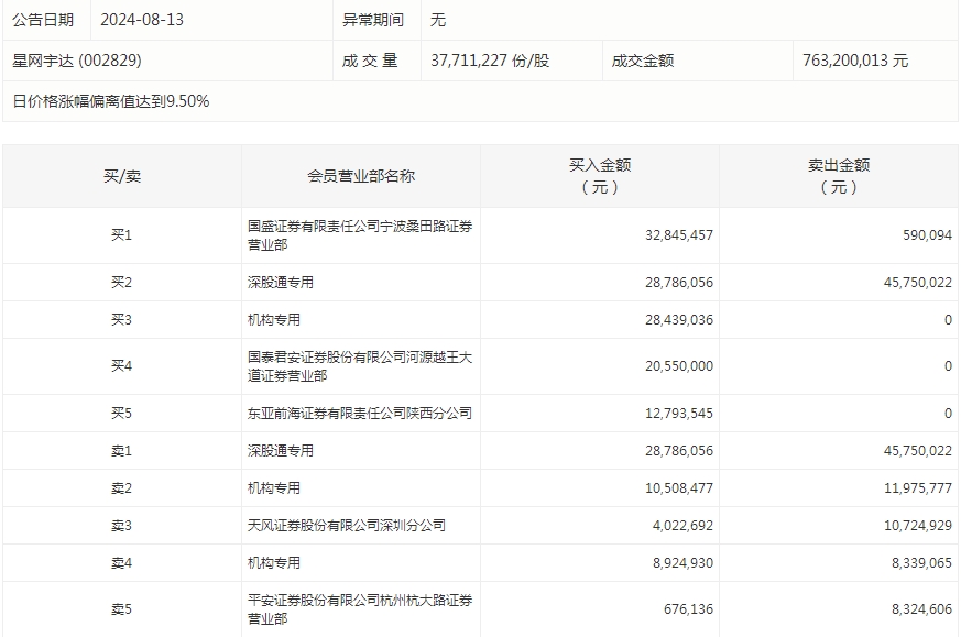 星网宇达今天涨停。盘后数据显示,3家机构出现在龙虎榜单上,合计净买入2755.76万元;国盛证券有限责任公司宁波桑田路证券营业部买入3284.55万元,同时卖出59.01万元;股份有限公司深圳分公司买入402.27万元,同时卖出1072.49万元。