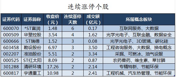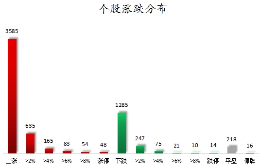 截至收盘,沪深两市合计3585只个股上涨,1285只个股下跌,平盘个股218只,停牌的个股16只。不含当日上市新股,共有48只个股涨停,14只个股跌停。连续涨停天数看,已连收6个涨停板,连续涨停板数量最多。